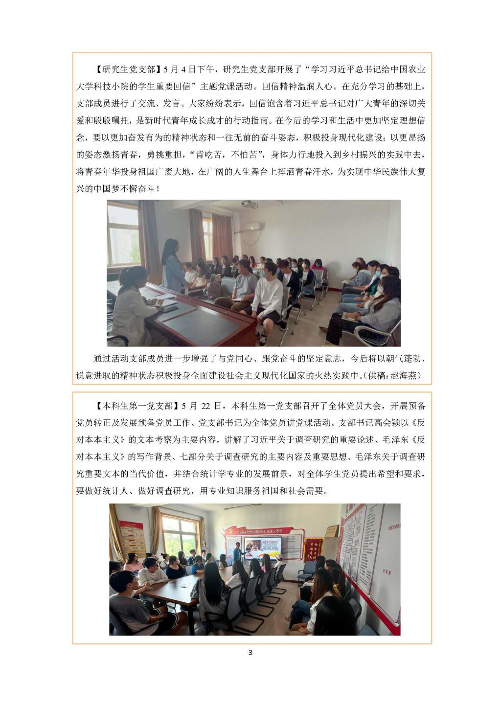 【研究生党支部】5月4日下午,研究生党支部开展了“学习习近平总书记给中国农业大学科技小院的员工重要回信”主题党课活动。回信精神温润人心。在充分学习的基础上,支部成员进行了交流、发言。大家纷纷表示,回信饱含着习近平总书记对广大青年的深切关爱和殷殷嘱托,是新时代青年成长成才的行动指南。在今后的学习和生活中更加坚定理想信念,要以更加奋发有为的精神状态和一往无前的奋斗姿态,积极投身现代化建设;以更昂扬的姿态激扬青春,勇挑重担,“肯吃苦,不怕苦”,身体力行地投入到乡村振兴的实践中去,将青春年华投身祖国广袤大地,在广阔的人生舞台上挥洒青春汗水,为实现中华民族伟大复兴的中国梦不懈奋斗!