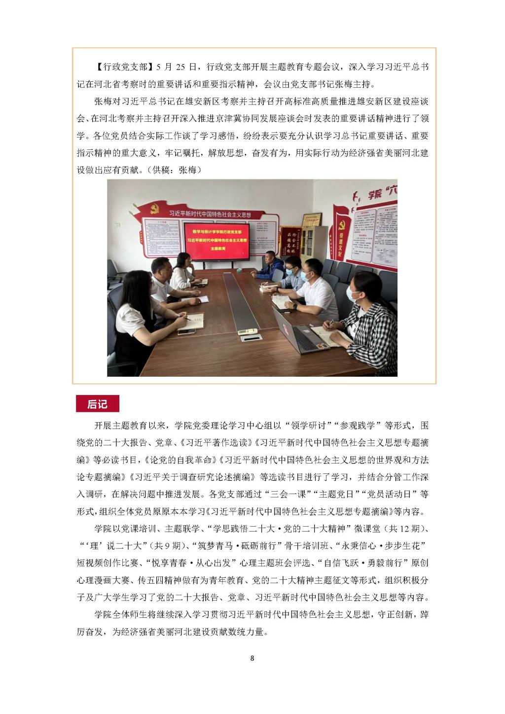 【行政党支部】5月25日,行政党支部开展主题教育专题会议,深入学习习近平总书记在河北省考察时的重要讲话和重要指示精神,会议由党支部书记张梅主持。