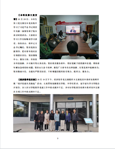 【本科生第三党支部】10月20日,本科生第三党支部全体党员集中学习了习近平总书记同团中央新一届领导班子集体谈话时的讲话。大家结合学习工作实际畅谈学习感受,纷纷表示,将牢记习近平总书记嘱托,坚持党的全面领导,把对青年的政治引领摆在首位;坚持围绕中心、服务大局,积极投身科技创新、乡村振兴等火热实践;坚持联系服务青年,用好党赋予的资源和渠道,帮助青年解决急难愁盼问题;坚持永久奋斗精神,激发广大青年在改革创新、攻坚克难中挺膺担当;坚持勤廉本色,全面从严管团治团,不断增强团组织的引领力、组织力、服务力。