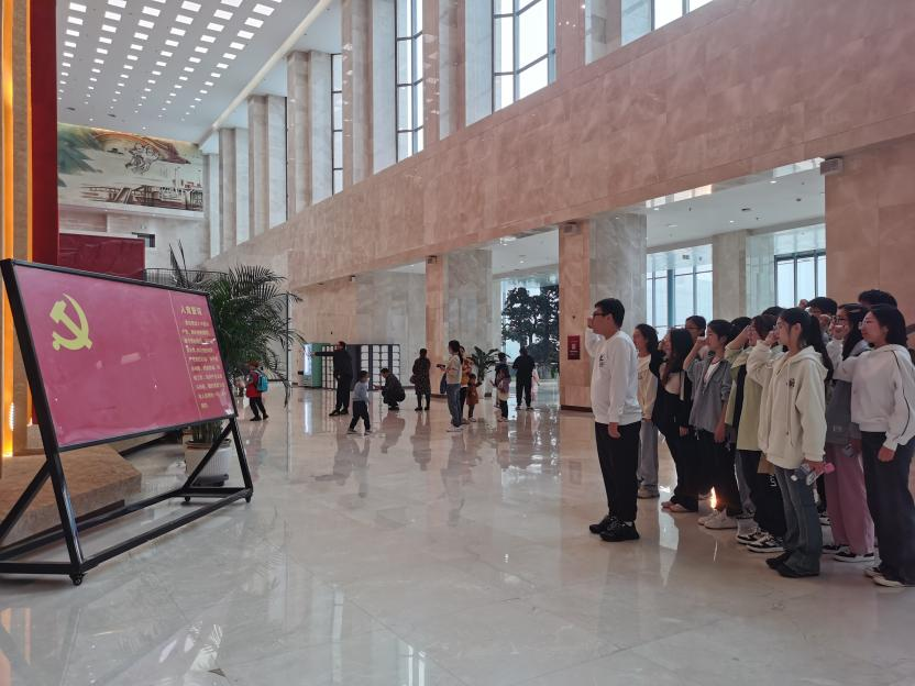 【本科生第三党支部】10月29日,本科生第三党支部开展“传承红色基因,汲取奋进力量”主题党日活动,组织全体党员赴石家庄解放纪念馆参观学习。在石家庄解放纪念馆大厅,全体党员庄严肃立,重温入党誓词,面对鲜红的中国共产党党旗庄严宣誓。铿锵有力的铮铮誓言,表达了全体党员传承红色血脉、牢记初心使命的决心。