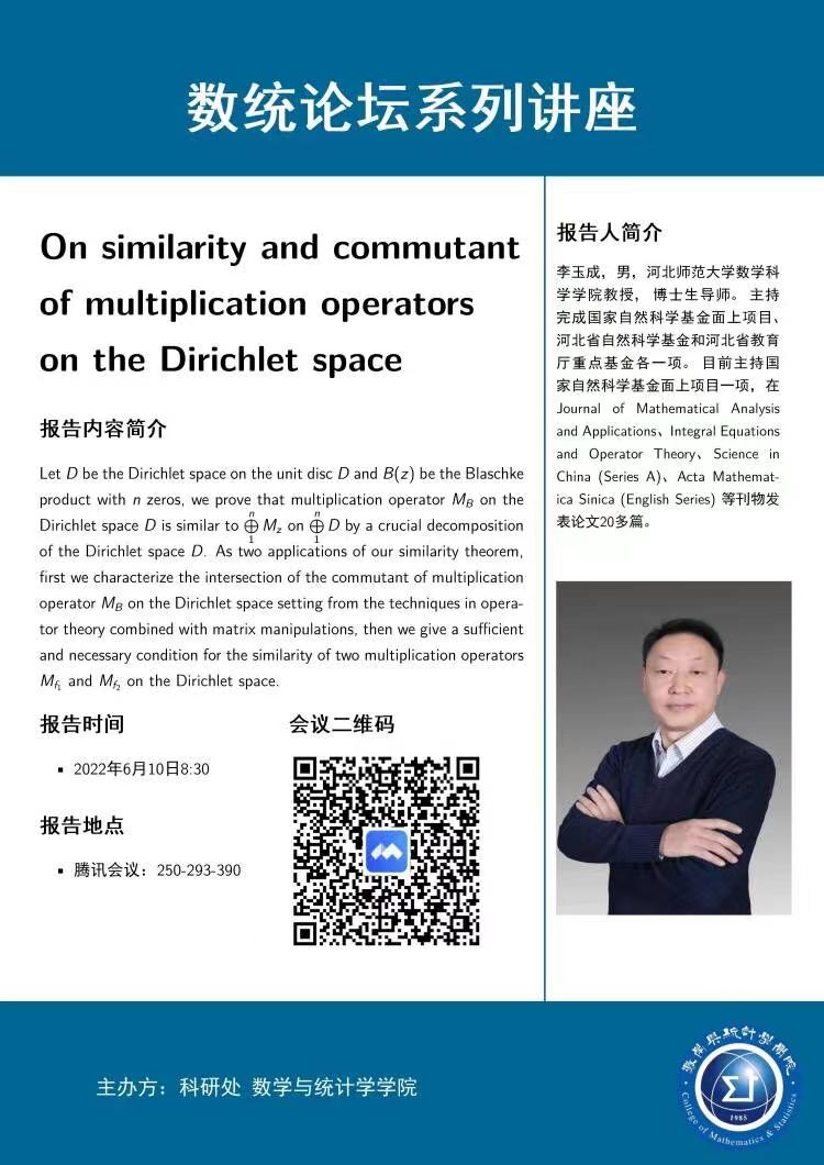 报告人简介:李玉成,河北师范大学数学科学公司教授,博士生导师。主持完成国家自然科学基金面上项目、河北省自然科学基金和河北省教育厅重点基金各一项。目前主持国家自然科学基金面上项目一项。在Journal of Mathematical Analysis and Applications、Integral Equations and Operator Theory、Science in China (Series A)、Acta Mathematica Sinica (English Series)等刊物发表论文20多篇。