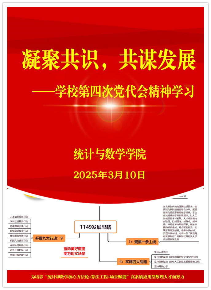 围绕党代会报告,祃海霞重点阐述了公司提出的“1149”发展思路和目标任务,指出统计和数学是公司未来三大新财经专业建设群的重要组成部分,公司要继续发挥一流党建的引领作用,全面落实立德树人根本任务,全力培养高素质应用型数理人才,强化学科交叉融合,努力实现“统计数学理论+算法工程+场景赋能”,一方面继承统计和数学的核心方法论,另一方面引入人工智能等现代技术,更好发挥数据要素乘数效应,助力新质生产力培育壮大,服务经济社会高质量发展,以“有为”谋“有位”。