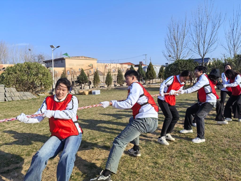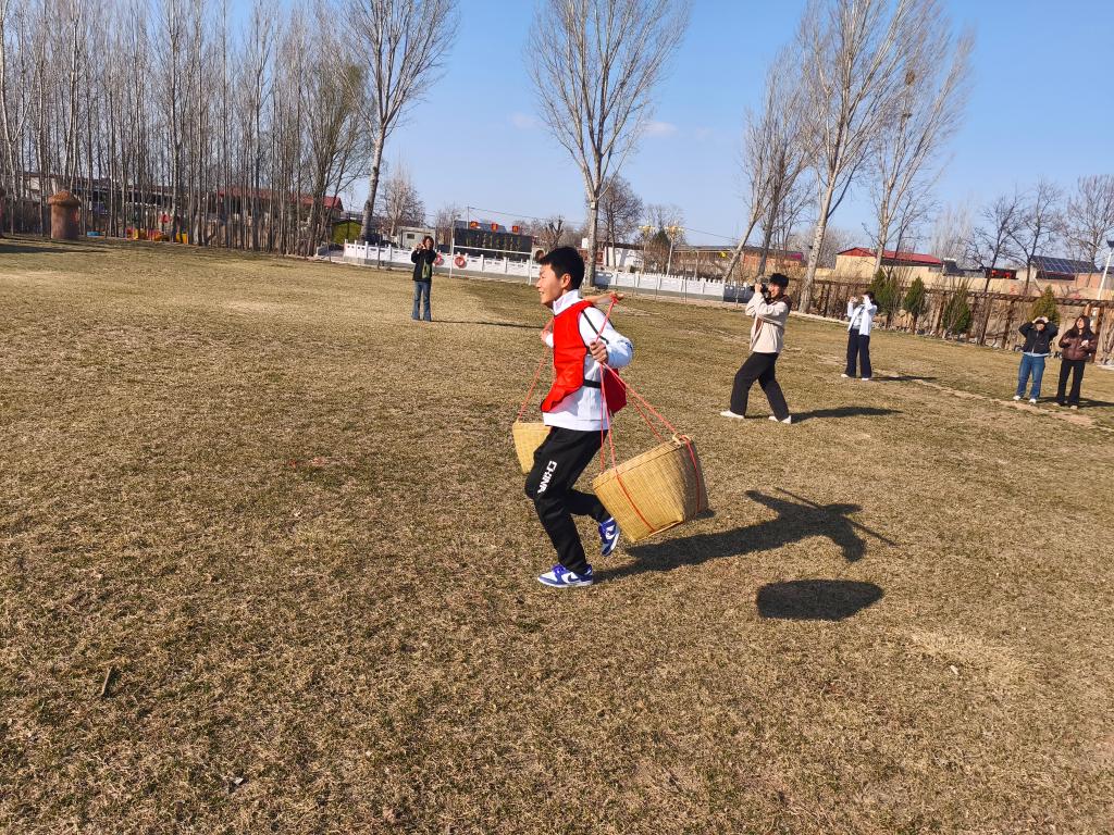 参观结束后,师生分成两支队伍先后参加了四项红色体育运动。第一个项目是“重走地道”。洞隧寻踪—重走地道战之路,感悟智慧烽烟,师生走进蜿蜒的地道,弯腰快步前行,"打一枪换一个地方,绝不放空枪"的经典画面历历在目,大家无不感叹革命前辈的智慧与勇气。第二个项目是“挑粮小道”。挑粮励志—铺就星火粮道,丈量信仰里程,师生们肩挑重担,坚定前行,重现军民一家亲的感人场景。第三个项目是“摸石过河”。渡河擎炬—体验摸石过河,感悟革命艰辛,借助“三块砖”移步,考验着大家的平衡能力与耐心,正如革命道路上克服各种艰难险阻,坚定必胜决心。第四个项目是“拔河比赛”。纤索共震—解码红色竞技,凝聚奋斗伟力。参赛队伍团结一心,展现出强大的团队凝聚力与坚韧不拔的奋斗精神。