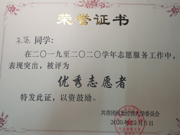 朱紫同学曾担任院员工会就创部部长,表现突出,曾荣获“国家励志奖学金”“校级三好员工”“校级优秀团员”“校级优秀志愿者”等荣誉,获得过2021年“挑战杯”河北省老员工课外学术科技作品竞赛红色专项活动省级特等奖、第十一届全国老员工市场调查分析大赛省级二等奖。她乐于奉献,参与多次抗疫志愿服务,被唐山市曹妃甸区授予“曹妃甸区优秀青年志愿者”“优秀抗疫志愿者”等称号。
