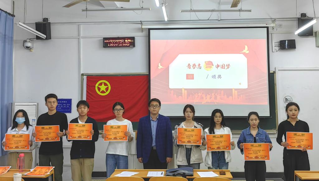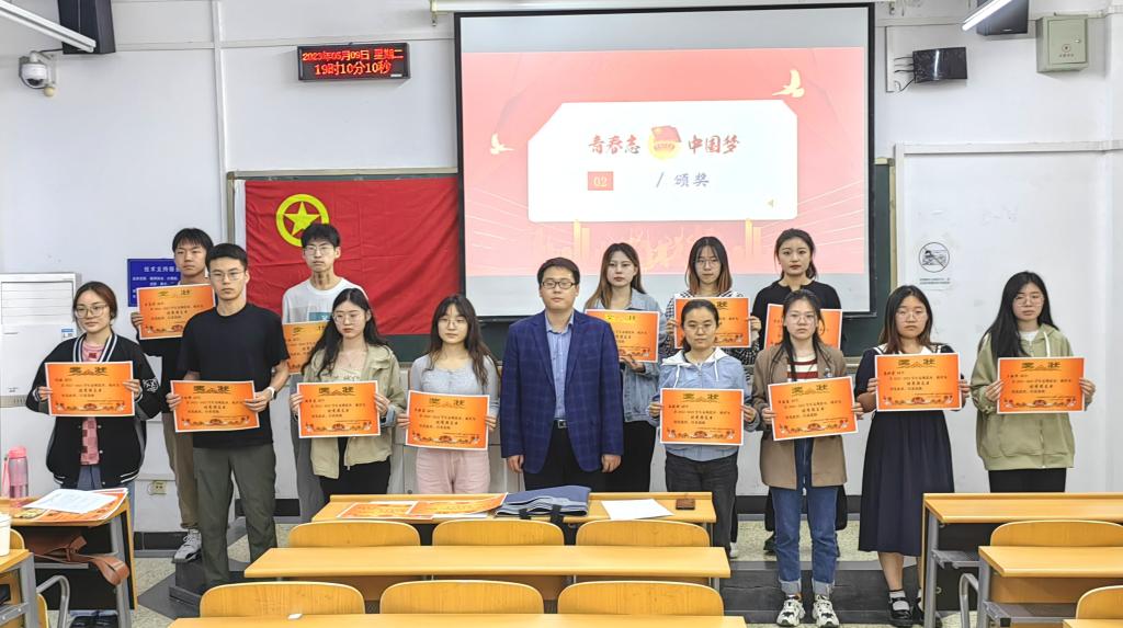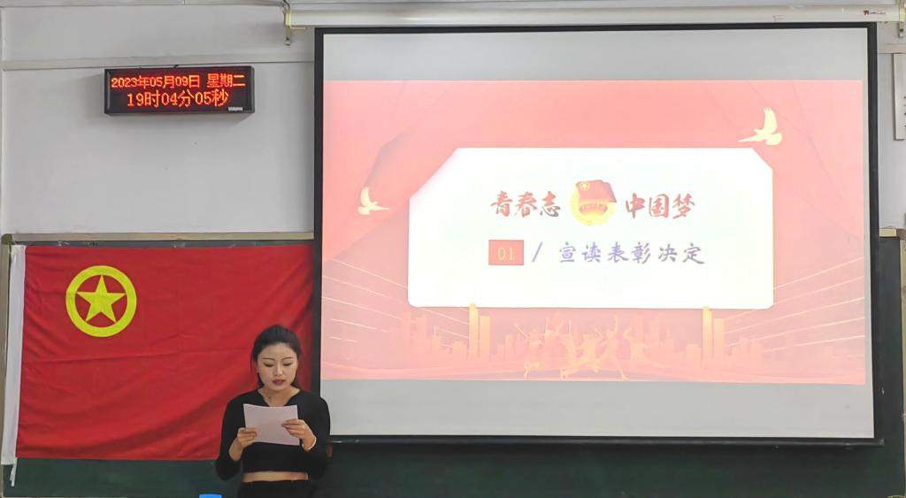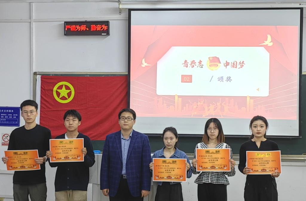 大会在雄壮激昂的国歌声中拉开序幕。首先,团委组织部部长袁晨雨宣读了《关于2022-2023年度“优秀团干部”“优秀团支书”“优秀团支部”的表彰决定》,王洋老师为获奖同学颁奖并合影留念。