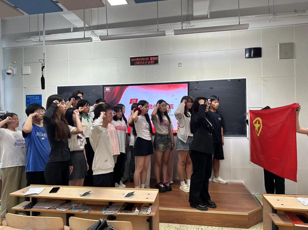 入团仪式在庄严的国歌声中拉开帷幕,团委组织部部长王阳宣读新团员名单后,王洋老师为新团员代表佩戴团徽,颁发团章和团员证。大家在团委组织部部长孙思琪带领下进行入团宣誓,一声声铿锵有力的誓言在教室内回荡,诠释着新团员的使命和担当,握紧的右拳表明了团员们坚定的信念和决心。新老团员代表分别在仪式上发言,号召大家要牢记誓言,继承和发扬共青团的优良传统,以高昂的姿态,团结在团旗下,高扬理想的风帆,焕发青春的激情,向着新的目标乘风破浪、勇往直前。