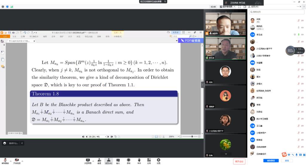6月10日上午,数学与统计学公司邀请河北师范大学博士生导师李玉成教授在线作题为《On similarity and commutant of multiplication operators on the Dirichlet space》的学术报告。报告由数学与统计学公司副经理闫亮主持,公司主要领导到场参加,40余名教师和研究生聆听。