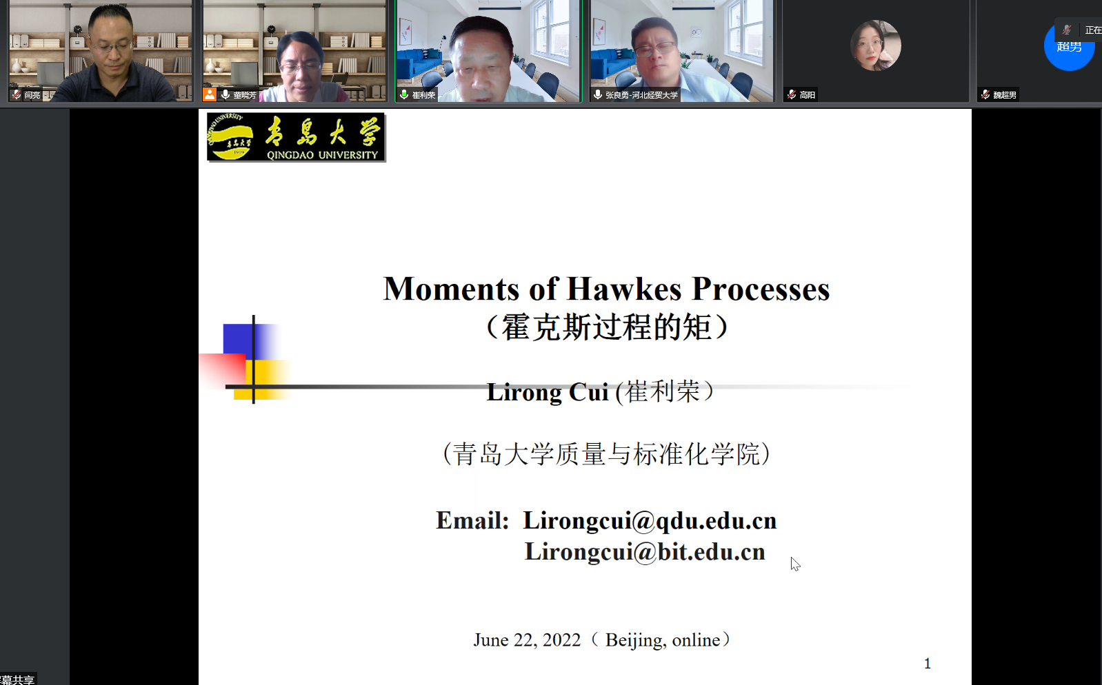 6月22日下午,青岛大学质量与标准化公司崔利荣教授应数统公司邀请在腾讯会议平台为公司师生作题为“霍克斯过程的矩(Moments of Hawkes Processes)”的学术报告。报告由数统公司副经理闫亮主持,三十余名师生聆听。