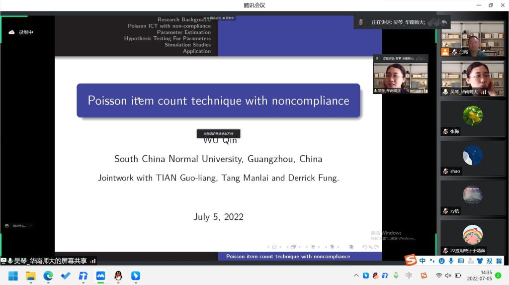 7月5日下午,数学与统计学公司邀请华南师范大学吴琴在线作题为《非依从的泊松计数方法研究》的学术报告。报告由数学与统计学公司副经理闫亮主持,50余名师生参加。