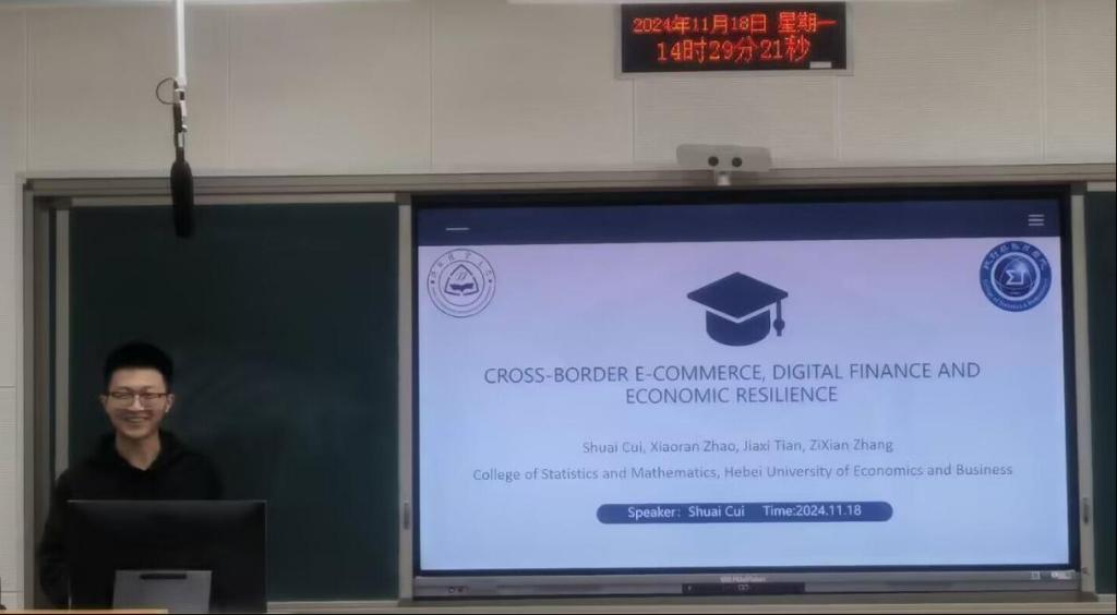 2023级应用统计专业优秀研究生崔帅发表报告。报告主题为"CROSS-BORDER E-COMMERCE, DIGITAL FINANCE AND ECONOMIC RESILIENCE"。在报告中,他以中国跨境电子商务综合试验区为准自然实验,运用双重差分法,探究跨境电子商务对城市经济韧性的具体作用和影响路径。为我国各类城市推行跨境电商综合试验区政策积累了宝贵的实证经验,也为跨境电商促进经济稳定发展提供了依据。