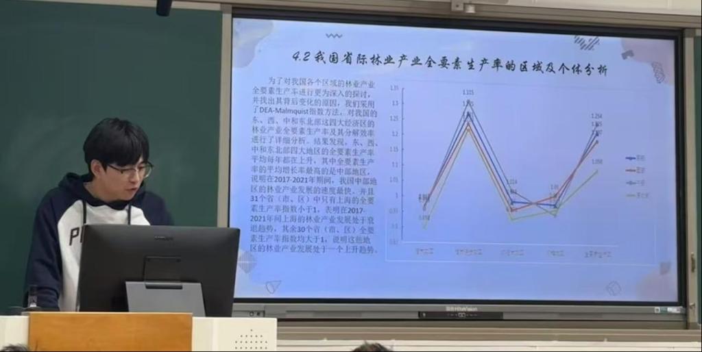 2023级应用统计专业优秀研究生杜雷发表报告。报告主题为“我国林业产业全要素生产率评价及区域差异分析”。他选取我国2017-2021年31个省(市、区)的面板数据,运用DEA-Malmquist指数方法对我国林业产业全要素生产率及其分解效率进行动态分析,并通过计算泰尔指数来对我国全要素生产率进行区域差异分析。为因地制宜发展相关地区的政策,促进科技在林业产业方面提供些许证据。