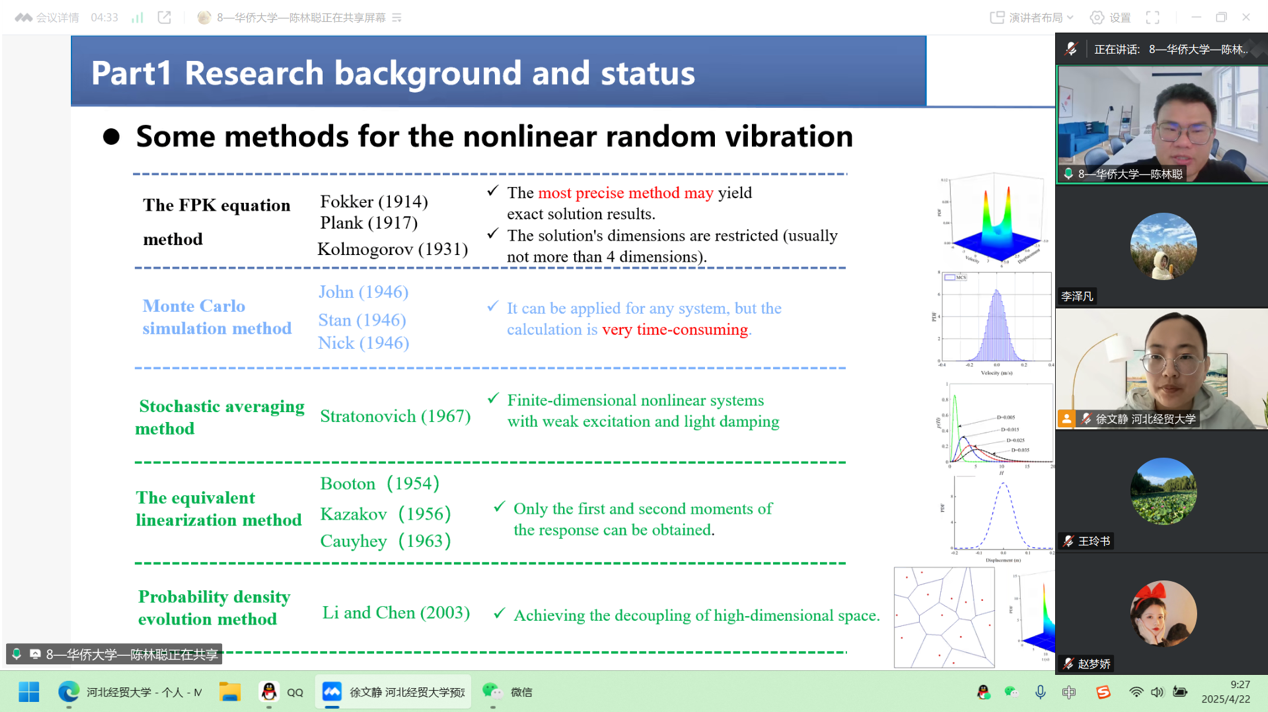 4月22日上午,华侨大学陈林聪教授应EMC易倍邀请线上作题为“一种高斯白噪声下求解强非线性系统高维FPK方程的高效方法”的学术报告,相关专业师生20余人参会。