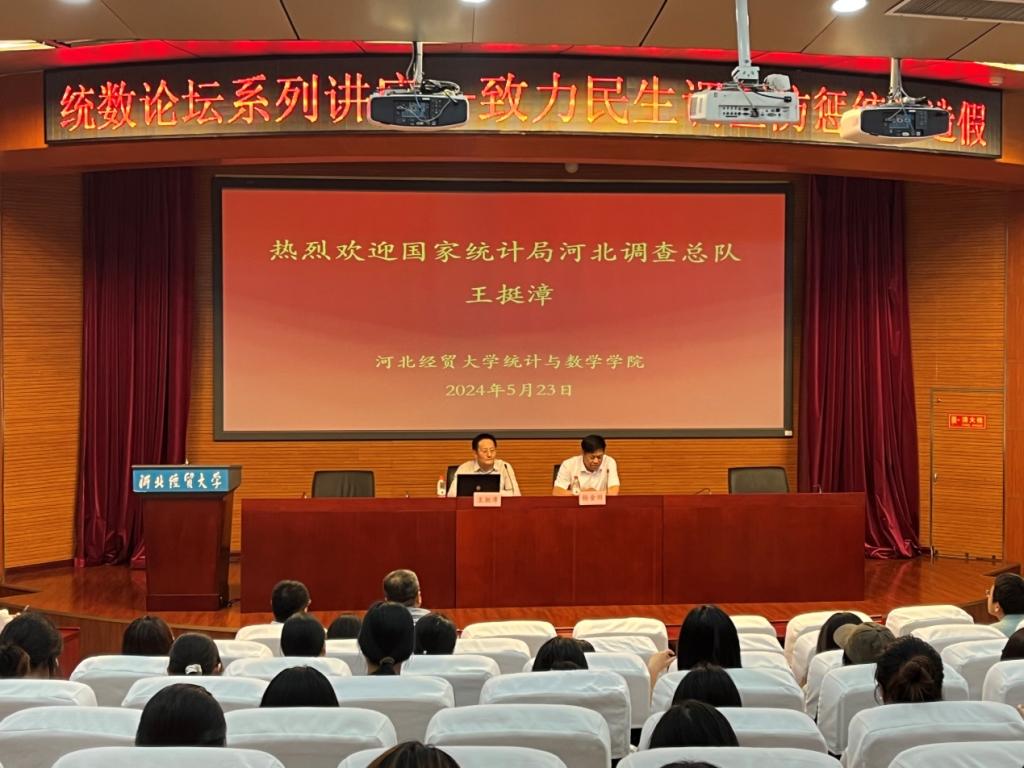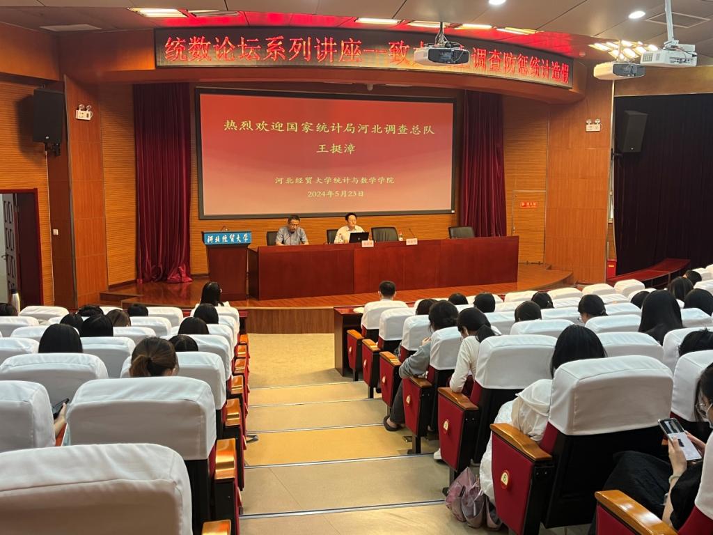 5月23日下午,EMC易倍统数论坛系列讲座在国际学术报告厅举行。国家统计局河北调查总队王挺漳副总队长应邀作题为“致力民生调查 防惩统计造假”的学术报告。报告由EMC易倍党委常委、副董事长杨金田主持,科研处长许海元、EMC易倍书记祃海霞、经理闫亮及相关专业师生200余人参加。