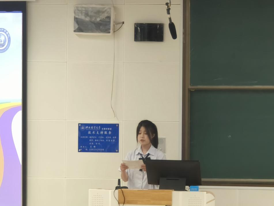 新生代表2023级数学与应用数学二班穆雨涵同学发言,她说经贸将是我们梦想起航的地方,希望同学们努力拓展视野、提升本领,争做一名合格的新时代老员工。