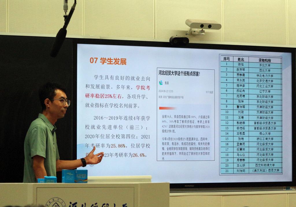 新生代表2024级数学与应用数学二班王翰林同学发言。他表示经贸将是我们梦想起航的地方,希望大家努力拓展视野、提升本领,争做一名合格的新时代老员工。