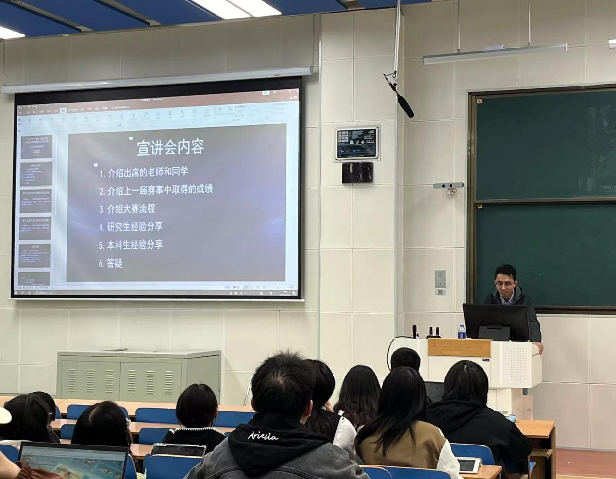 随后,本科生组获奖成员孙天伦同学从自身参赛经验出发,从组队环节、选题环节、问卷设计、数据分析、PPT制作等5个环节向同学们进行了重点讲解。其中孙天伦同学强调了在问卷设计过程中,同学们需要考虑模型应用、问题设置的完备性、问卷整体的可读性等方面,为同学们带来了宝贵的经验分享。