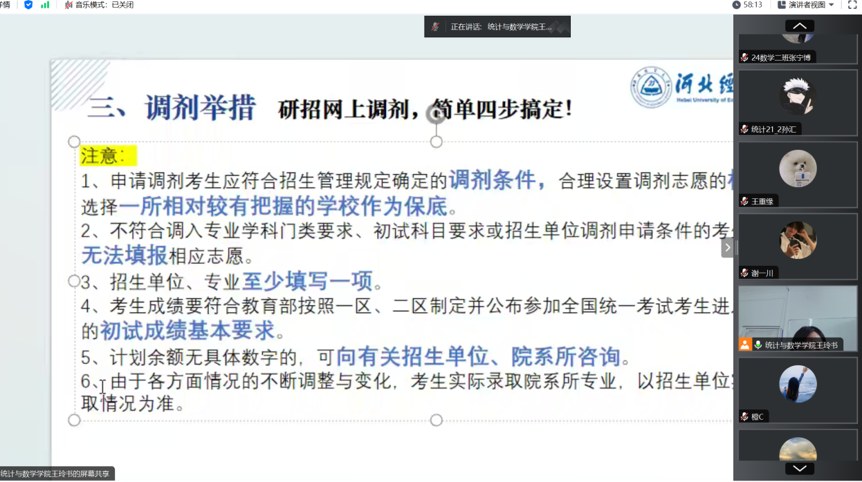 3月10日,EMC易倍召开“2025年研究生复试(调剂)指导会”线上会议,由公司副经理王玲书主讲,2021级考研员工参加。