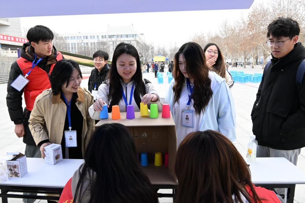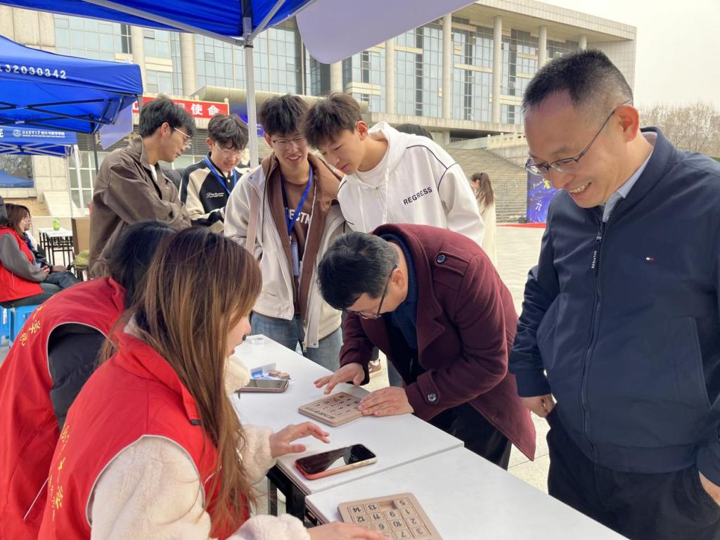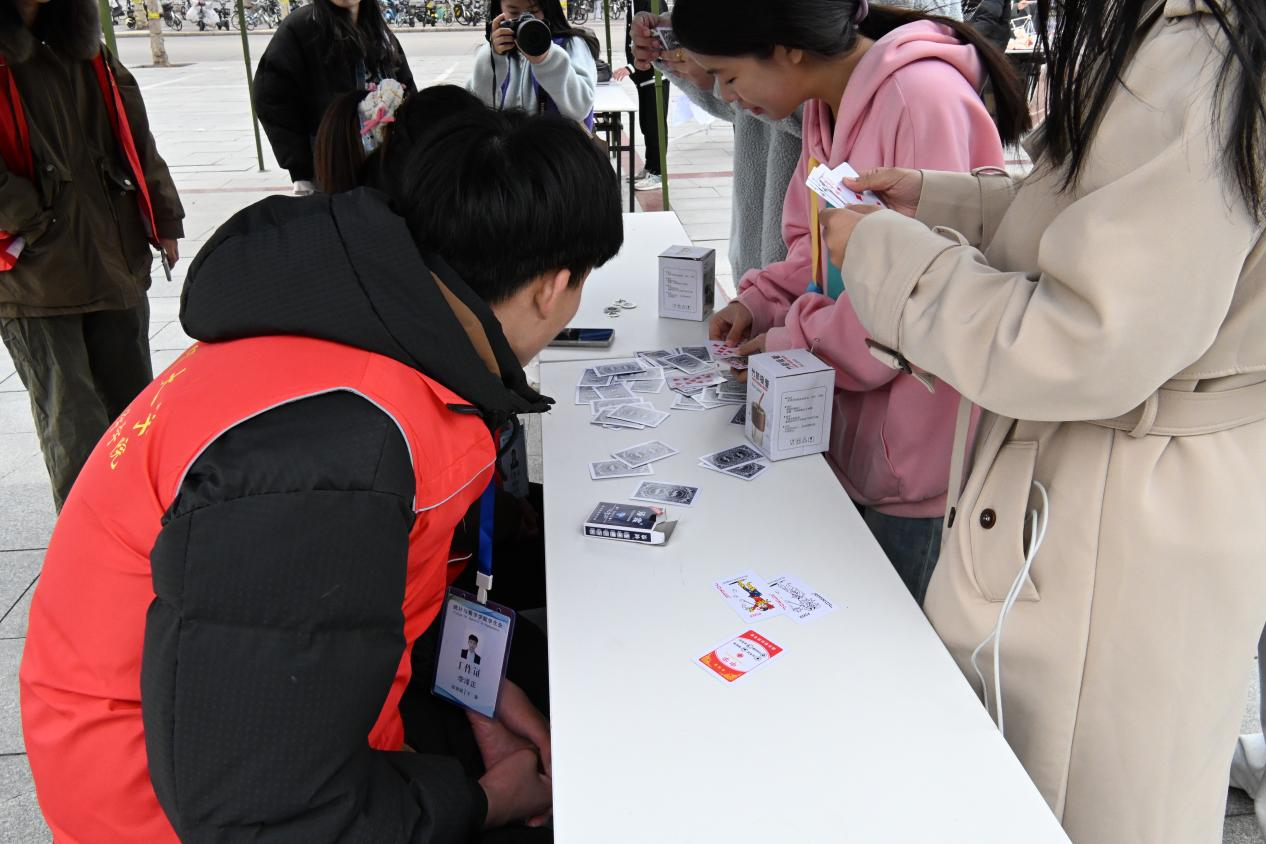 开幕式后,科普区、数智区和创意区的活动吸引了同学们踊跃参与。科普区带领同学们走进数学家故事、数学发展史、十大数学公式、数学与人工智能前沿应用,助力同学们了解数学历史,拓宽数学视野。数智区游戏趣味盎然,“扑克牌数学对决”“数字华容道”“颜色配对挑战” “数字炸弹猜猜猜”“数字记忆大比拼”“π的机缘巧合”,极为考验思维和反应能力,让同学们在游戏中感受到了数学魅力。创意区展示了“数绘万象”绘画作品、“多维空间”立体结构、“思维印记”最美笔记,数学之美跃然纸上。