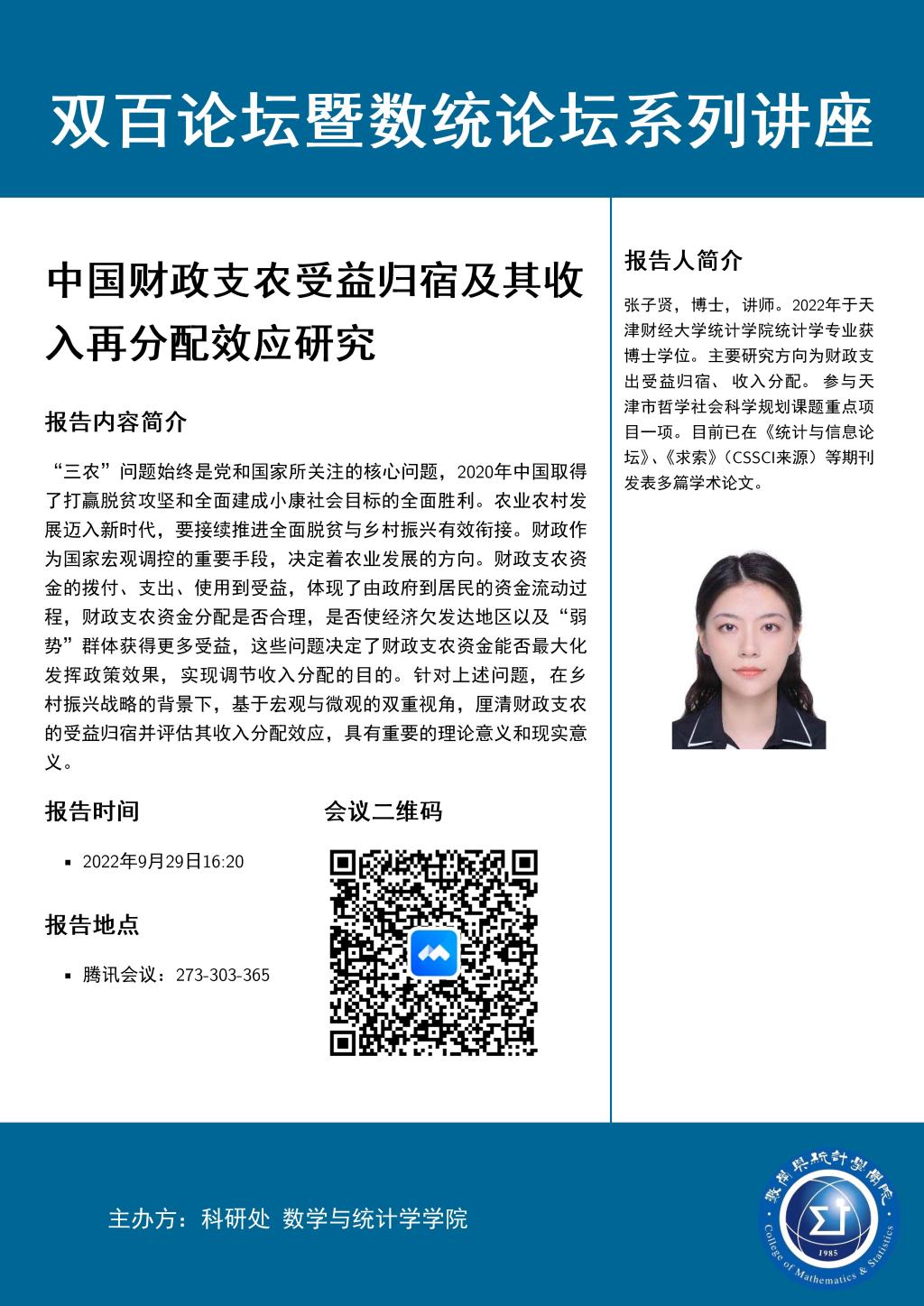 张子贤,博士,讲师。2022年于天津财经大学统计公司统计学专业获博士学位。主要研究方向为财政支出受益归宿、收入分配。参与天津市哲学社会科学规划课题重点项目一项。目前已在《统计与信息论坛》、《求索》(CSSCI来源)等期刊发表多篇学术论文。