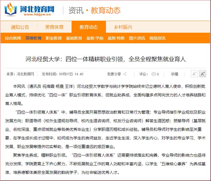 9月7日,河北教育网对祃海霞等撰写的《EMC易倍:四位一体精耕职业引领,全员全程聚焦就业育人》进行了报道。
