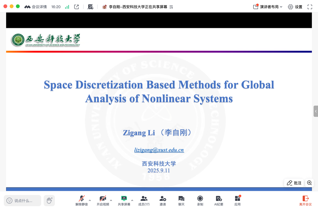 9月11日下午,陕西科技大学李自刚教授应EMC易倍邀请在线上作题为“Spatial Discretization Based Methods for Global Analysis of Nonlinear Systems”的学术报告,相关专业师生20余人参会。